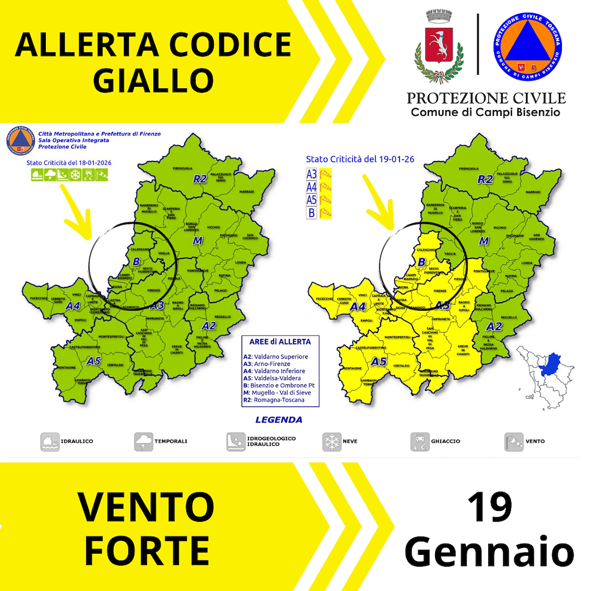 Emessa dalla sala operativa Regionale, allerta codice GIALLO, per domani lunedì 19/1 per le zone Arno-Firenze, Valdarno Inferiore, Valdelsa-Valdera e Bisenzio-Ombrone Pt. Previsti venti di Grecale in rinforzo con forti raffiche sui rilievi e sulle pianure settentrionali.