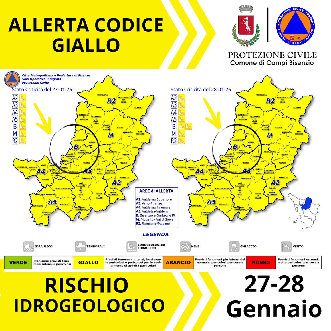 Emessa dalla sala operativa regionale, allerta codice GIALLO rischio idrogeologicoper oggi 27/1 e domani 28/1 per tutti i Comuni del territorio Metropolitano. Per la giornata di domani 28/1 per la zona del Bisenzio-Ombrone Pt.