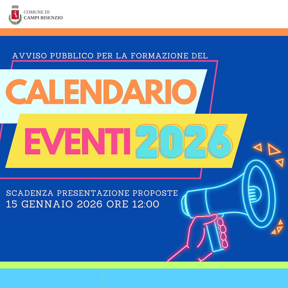 Con Determinazione Dirigenziale N. 1425 del 12/12/2025 è stato approvato l'avviso pubblico per la formazione del "Calendario Eventi 2026", nel quale saranno inseriti gli eventi organizzati sul territorio comunale in modo temporaneo ed occasionale da soggetti pubblici e privati, organizzazioni, organismi, Enti, imprese ed associazioni.