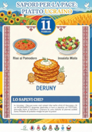 - 11 febbraio - Sapori per la Pace, il secondo appuntamento prevede un menù che unisce la cucina italiana con la tradizione Ucraina. Nelle nostre scuole sarà servito riso al pomodoro come primo piatto e come seconda portata il Deruny, un piatto semplice e gustoso a base di patate, farina e uova tipico della cultura gastronomica ucraina. L’iniziativa si propone come occasione di conoscenza di altre culture e spunto di riflessione e crescita per i nostri ragazzi e fa parte degli appuntamenti che Qualità e Servizi dedica ogni anno alle cucine del mondo. 12 febbraio - + vitamine, + salute per tutti: nelle scuole servite da Qualità e Servizi, saranno distribuire le Arance della Solidarietà. Con questa iniziativa, la nostra azienda rinnova il sostegno alle cure ai pazienti oncologici grazie alla collaborazione con ATT – Associazione Tumori Toscana.