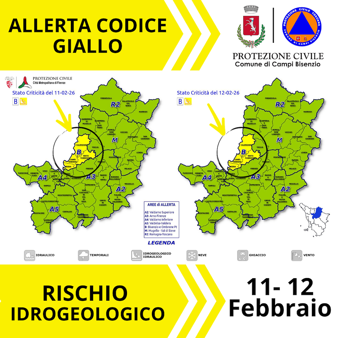 Allerta codice GIALLO rischio idrogeologico per i comuni del Bisenzio-Ombrone PT e domani 11/2 rischio vento per i comuni della Romagna-Toscana (Alto Mugello)