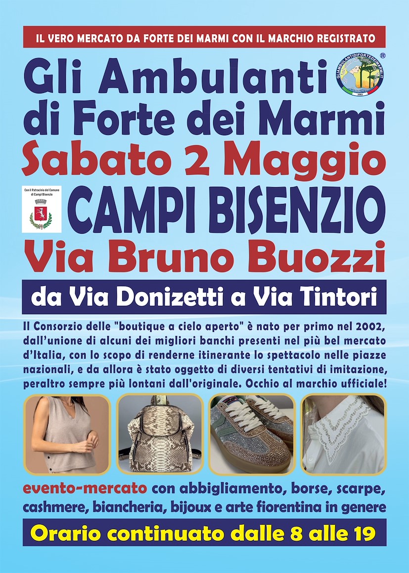 Il mercato da Forte dei Marmi, con marchio registrato, sabato 2 Maggio arriva in via Bruno Buozzi: abbigliamento, scarpe, accessori e arte fiorentina in genere.