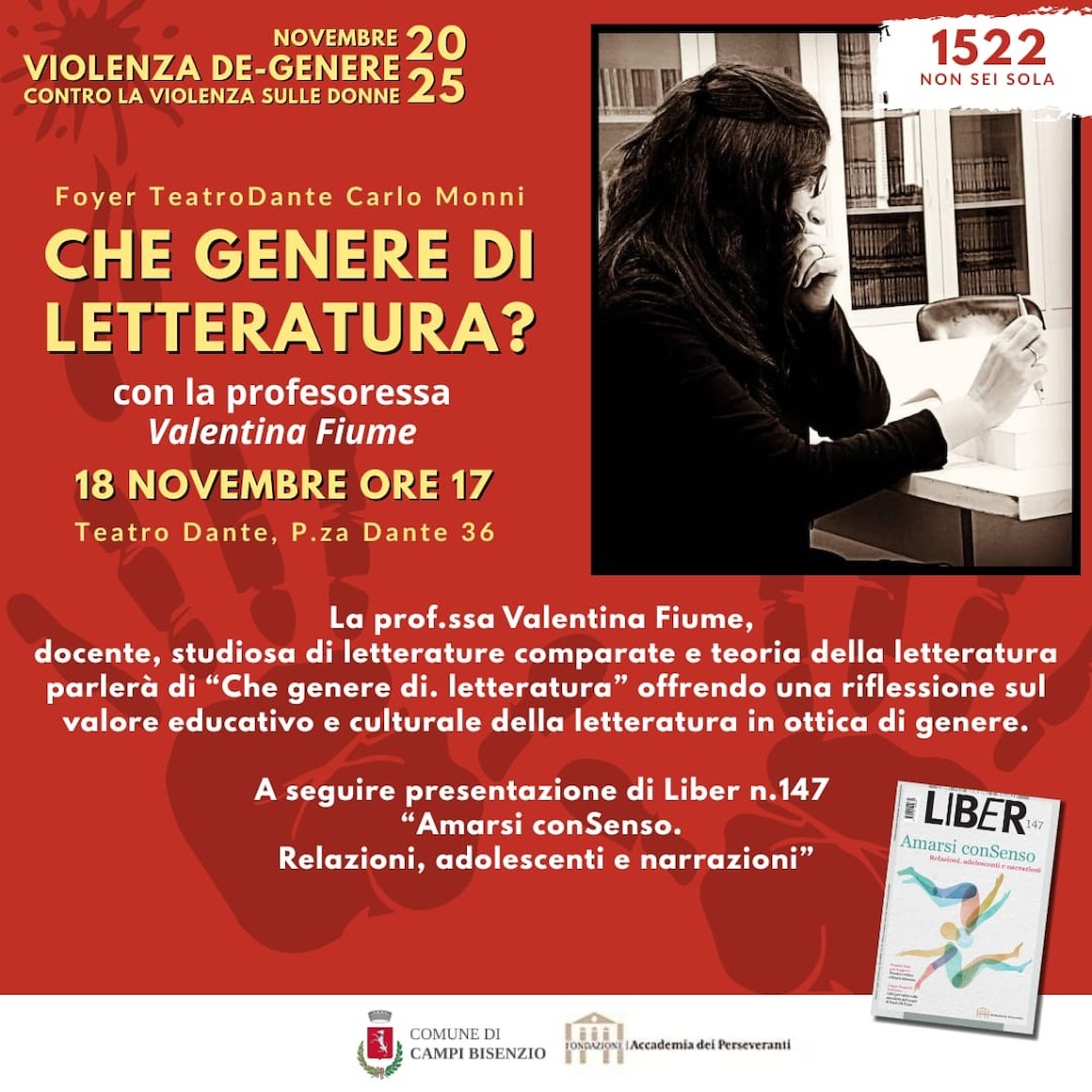La professoressa Valentina Fiume, docente e studiosa di letteratura comparata, attraverso l'incontro “Che genere di letteratura?” offrirà spunti di riflessione sul valore educativo e culturale della letteratura in ottica di genere.
