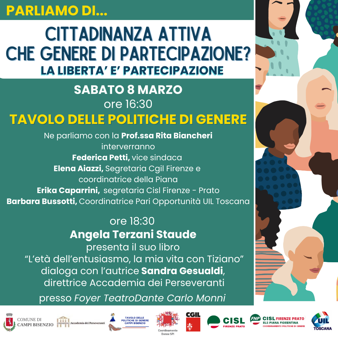 Ne parliamo con la Prof.ssa Rita Biancheri interverranno Federica Petti, vice sindaca Elena Aiazzi, Segretaria Cgil Firenze e coordinatrice della Piana Erika Caparrini, segretaria Cisl Firenze - Prato Barbara Bussotti, Coordinatrice Pari Opportunità UIL Toscana.