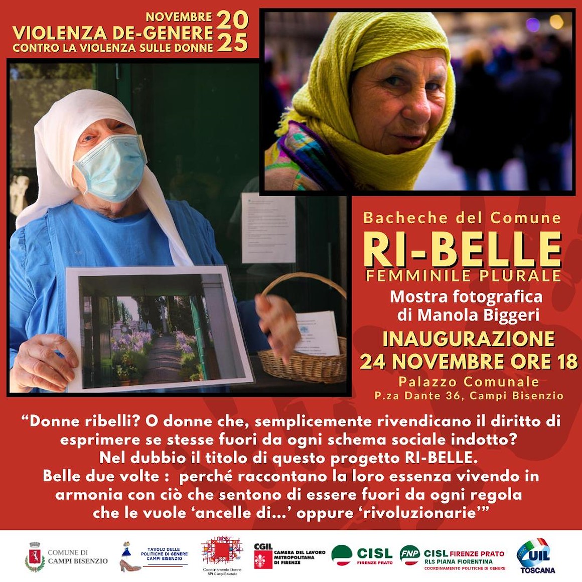 All'interno del calendario di eventi contro la violenza di genere, dal 17 Novembre al 6 Dicembre, nelle bacheche del Palazzo comunale,si terrà la mostra "Ri-belle, femminile plurale" a cura di Manola Biggeri. Fotografie che rivendicano il diritto delle donne ad esprimere sè stesse e raccontano la loro essenza.